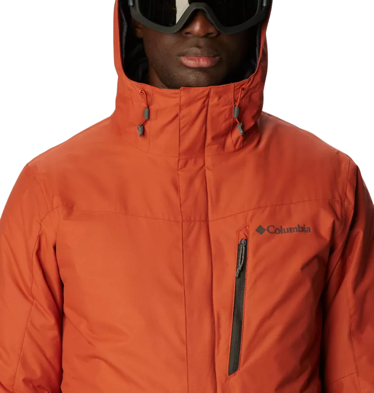 Mountain-ready features include ski pass, goggle, security, chest, and hand pockets, underarm vents and adjustable hood, powder skirt, cuffs, and hem.